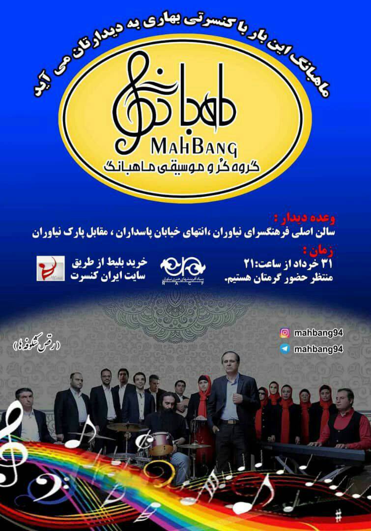 کنسرت گروه ماهبانگ که از هنرمندان نابینا و کم بینا تشکیل شده، پنجشنبه 31 خرداد 1397 ساعت 21:00 در فرهنگسرای نیاوران اجرا میشود. برای خرید بلیط میتوانید به این [ لینک ] بروید.
