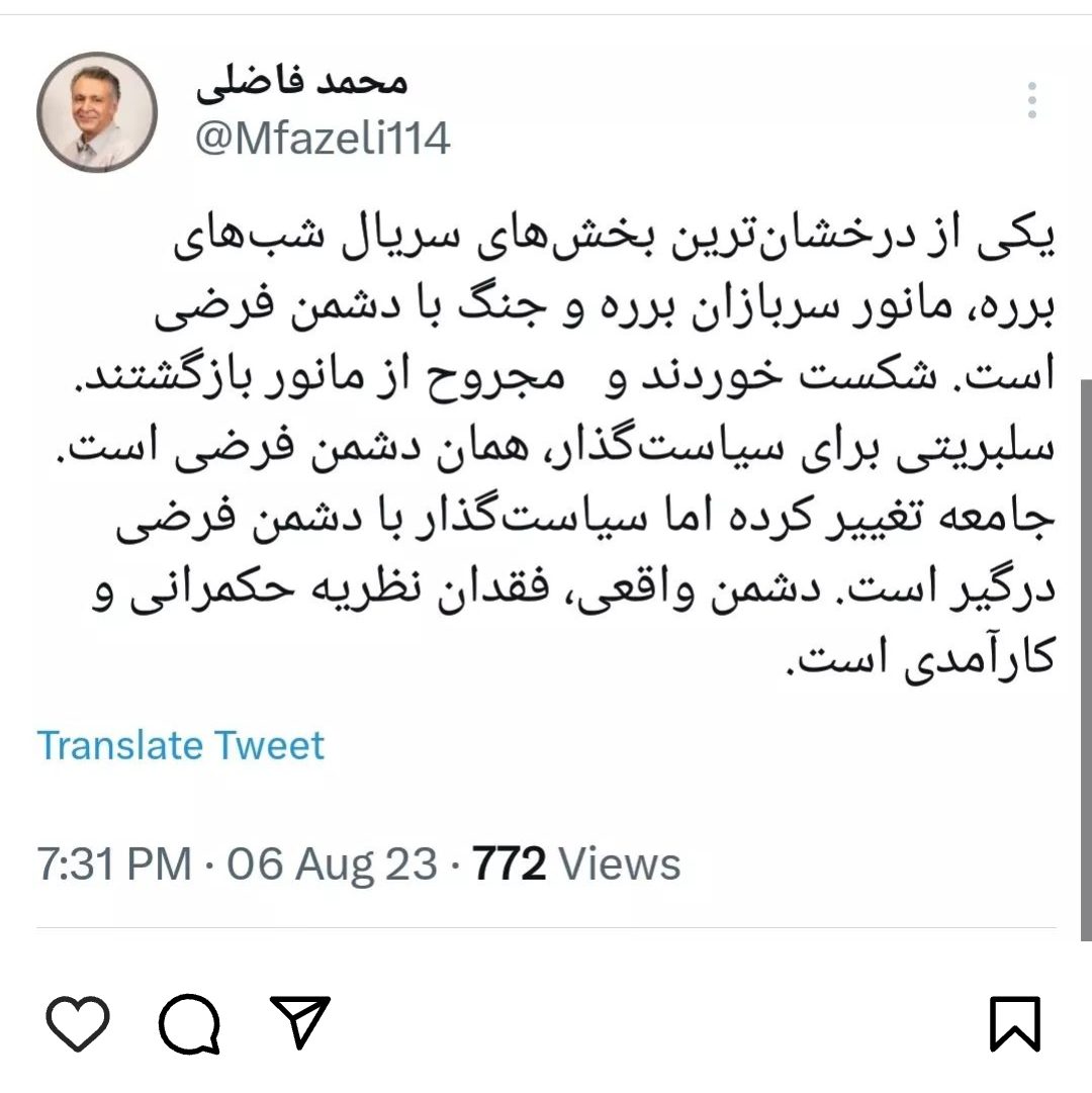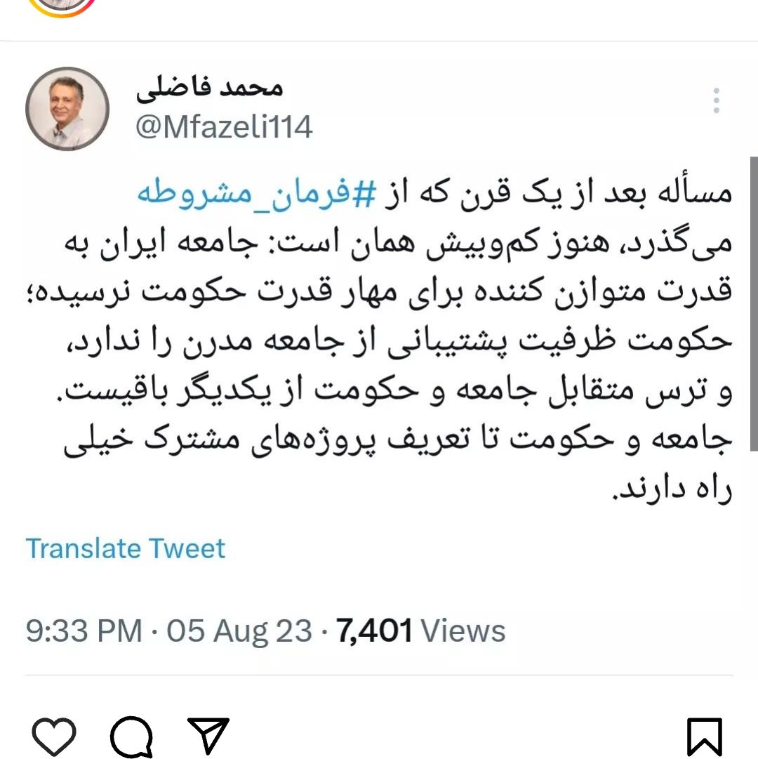 دو توییت از محمد فاضلی یکی درباره شب های برره و دشمن فرضی و دیگری مشروطه بعد از قرن را بخوانید.
