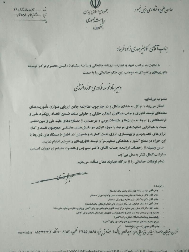 1. خوبه که به دبیری «ستاد توسعه فن آوری حوزه انرژی» بسنده کردن! ناقابل ماهی هم هفت هشت میلیون با حق ماموریت و اضافه کاری تقدیم آقا داماد میشه. اگر ریاست «دبیرخانه کارگروه تحقیق و توسعه فن آوری حوزه انرژی های نو» شده بودن چه باید می کردیم! لطفا یک مصاحبه با ایشان بگذارید و از وضعیت اتلاف انرژی در صنایع ایران بپرسید، البته پاسخ مشخص است!