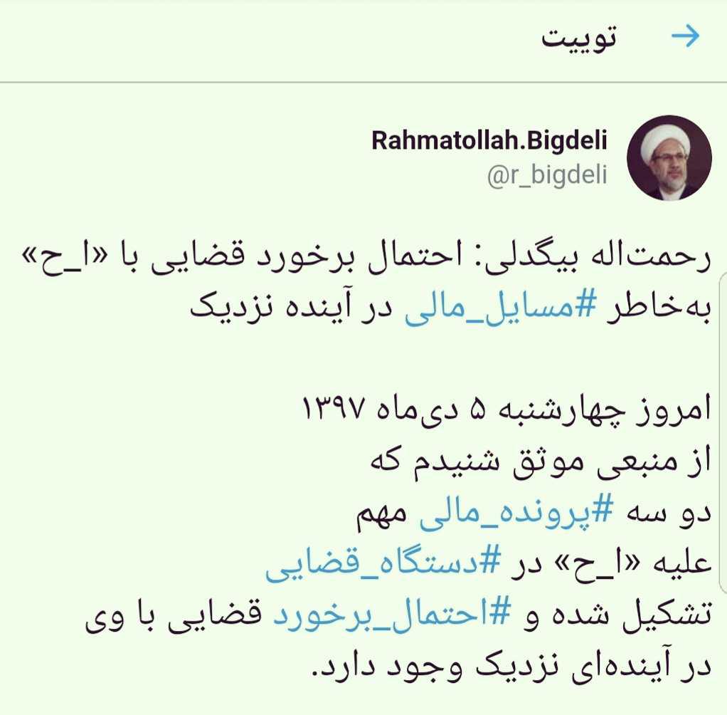 امروز چهارشنبه ۵ دیماه ۱۳۹۷ از منبعی موثق شنیدم که دو سه #پرونده_مالی مهم علیه «الف. ح» در #دستگاه_قضایی تشکیل شده و #احتمال_برخورد قضایی با وی در آیندهای نزدیک وجود دارد.»