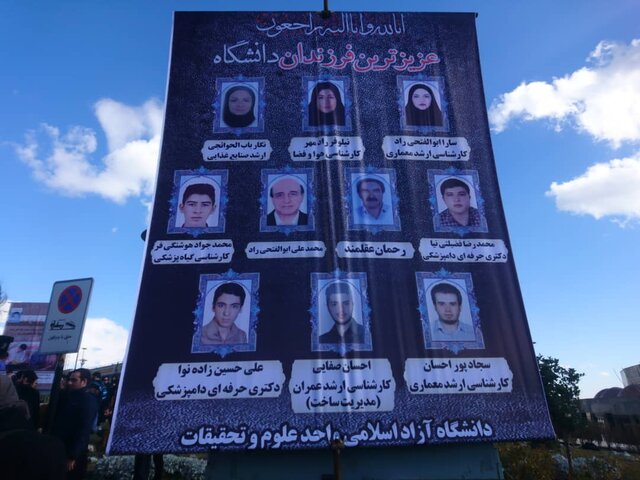 از صبح امروز، عبور و مرور دانشجویان از درب ورودی واحد علوم و تحقیقات دانشگاه آزاد در حالی با سختگیری پرسنل انتظامات انجام میشد که در ابتدای ورود به محوطه دانشگاه، چند حجله کوچک، به یاد دانشجویان حادثه دیده واحد علوم و تحقیقات برپا شده و صدای تلاوت قرآن به گوش میرسید. در این میان نیز یکی از دانشجویان در میان جمعیت گل مریم توزیع میکرد.