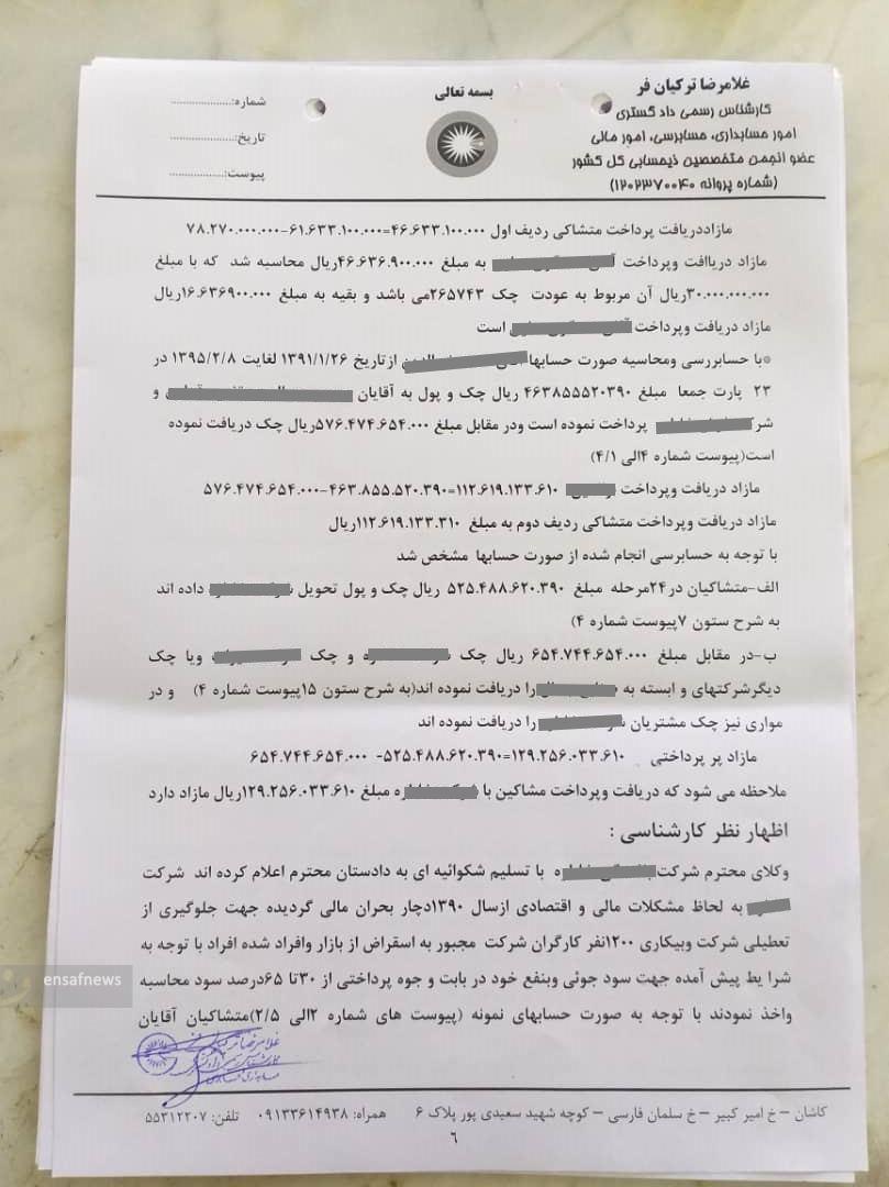 او در ادامه افزود: «نهادهای نظارتی کاشان بسیار مسوولانه وارد این موضوع شدند و تمامی ادعاهای ما و اسناد حسابداری ما را رسیدگی کردند؛ بعد از چندین ماه رسیدگی، دادستانی گزارشی تهیه کرد که این گزارش منجر به پرونده کیفری در شعبه ۶ بازپرسی علیه حدود چندده نفر شد. نهادهای نظارتی به خاطر اهمیت موضوع به صورت ویژه وارد پرونده شدند و رسیدگیهای مفصلی را در این خصوص انجام دادند. آقای ع.الف متهم به ۴۸ درصد و آقای م.س متهم به دریافت ۳۰ تا ۷۰ درصد ربا است.»