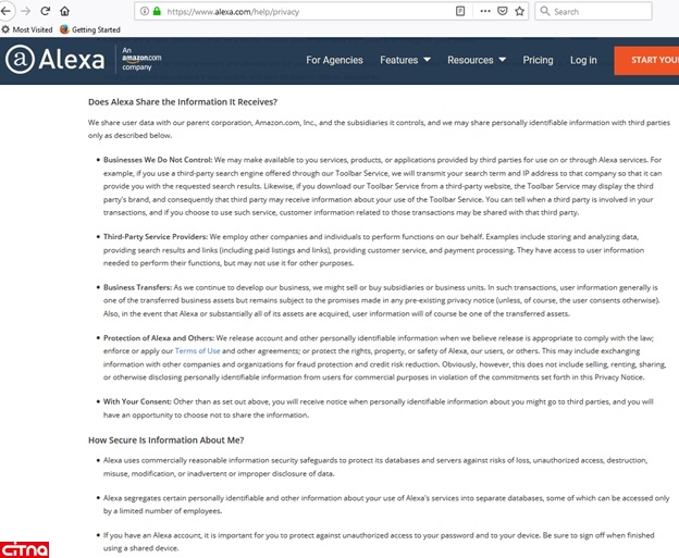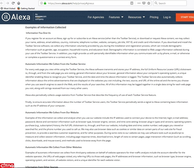 3. حجم قابل توجهی از اطلاعات کاربران ایرانی در اختیار این شرکت آمریکایی قرار می گیرد. الکسا در قوانین استفاده از این کد آورده است که حتی فرم های پر شده توسط کاربران و تمامی اطلاعات شخصی قابل دسترس مانند آدرس، شماره تلفن، ایمیل و تمامی رفتارها و فعالیت های دیگر کاربران توسط الکسا و شرکت های همکارش مورد بهره برداری قرار خواهد گرفت.