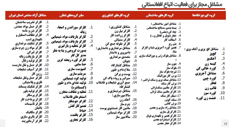 مشاغل مجاز برای اتباع افغانستانی