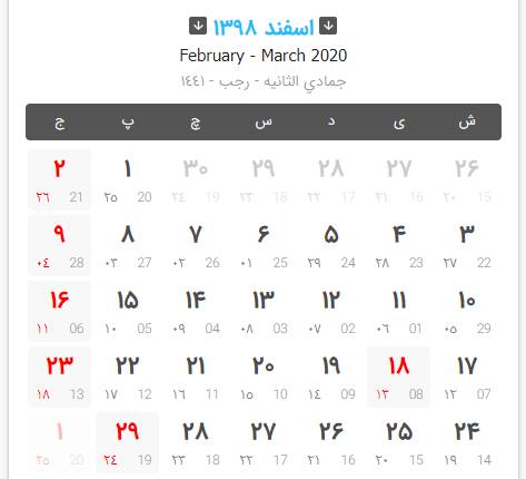 لحظهی تحویل سال 1398 هجری شمسی به ساعت رسمی کشور، ساعت 1:28:27 روز پنجشنبه 1 فروردین سال 1398 هجری شمسی برابر با 21 مارس 2019 میلادی است.