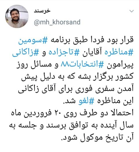 پیش از این نیز یکی از دستاندرکاران برگزاری این مناظره در توییتر خود از احتمال برگزاری آن در روز 20 فروردین ماه خبر داده بود: