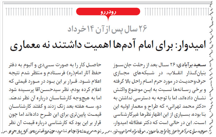 شرق همچنین در صفحه آخر این شماره نیز در گزارش «۲۶ سال پس از آن ۱۴ خرداد؛ امیدوار: برای امام آدمها اهمیت داشتند نه معماری» مصاحبهای با عطالله امیدوار، معمار مرقد داشته است: «۲۶ سال بعد از رحلت جانسوز بنیانگذار انقلاب، در شبکههای مجازی حرفوحدیث در مورد حرم امام راحل بالا گرفته و برخی رسانهها نسبت به این موضوع واکنش نشان دادهاند، اما با توجه به دسترسی نداشتن به «دکتر محمد تهرانی» که طراح و معمار اولیه این بنا بوده، بسیاری از این اظهارنظرها غیرکارشناسی است. این در حالی است که دکتر عطاالله امیدوار، معماری که خود طراح پاویون مرقد امام است، در گفتوگو با «شرق» تأکید میکند طرح اولیه اکنون با تغییرات فراوانی در حال ساختوساز است. در مرور تاریخچه ساخت مرقد مطهر امام راحل، حرفوحدیث بسیار است؛ اما به گفته امیدوار، ایده اولیه این طرح همزمان با رحلت آن بزرگوار، کاملاً سریع طراحی شده: «همزمان با چهاردهم خرداد سال ۶۸ یعنی تاریخ رحلت امام (ره)، ابتدا در جوار بهشت زهرا، کانکسهایی را کنار هم قرار دادند تا مقبره آن بزرگوار را احاطه کند. نکته جالبی در چینش این کانکسها بود، بهطوریکه ترکیب آنها از بالا شبیه معماری مکه شده بود». اما قدم بعدی پیداکردن معماری بوده که بتواند کار طراحی چنین پروژهای را بر عهده بگیرد: «پلان اولیه این طرح از آنِ دکتر تهرانی بود اما کمکم فعالیتهایی که توسط ارگانهای مختلف در آن دوره انجام شد، از این طرح فاصله گرفت و باعث شد پروژه با تغییرات و الحاقات فراوان ساخته شود. حتی در برخی موارد مشتاقان و عاشقانی بودند که طرحهایشان را برای افزودن به این پروژه به مسئولان ارائه میکردند.»