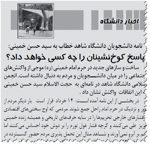 در ادامهی انتقادات روزنامهی کیهان، در شماره ۱۲ خرداد ۱۳۹۴، در صفحه ۱۰ به بازتاب نامهی دانشجویان دانشگاه شاهد خطاب به سید حسن خمینی با عنوان «پاسخ کوخ نشینان را چه کسی خواهد داد؟» پرداخته است در بخشی از این نامه آمده است: «۱۴ خرداد قرار است بار دیگر مردم از دور و نزدیک در حرم امام راحل جمع شوند. مردمی که اوج سختیهای اقتصادی و فشارهای خارجی تحریمها را در سایه حرفهای تاریخی و همیشه زنده خمینی عزیز طی میکنند و گرچه فشار غول تورم را بر دوش خود احساس میکنند اما خم بر آبرو نمیآورند و شاهد مثال این تحمل پذیری مردم حضور گسترده در راهپیمایی ۲۲ بهمن است. حال آن کوخنشینی که از دور افتادهترین نقاط سیستان و بلوچستان به عشق دیدار و تجدید عهد با آرمان امام خمینی به حرم میآید و با این کاخ روبرو میشود با خود چه فکر میکند؟ مطمئناً پیش از همه این اتفاق را به شما نسبت میدهند که چرا مانع این اسراف و تجملگرایی نشدید.