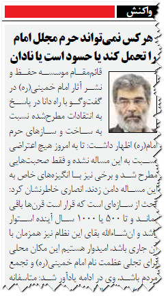 گیرم اصلاً این امام پیشوای مستضعفین و محرومین نبود و فقط باید سالی یکبار و در مناسبات خاص برخی مسوولان در مسیر سفرهای خارجی و سر راهشان از شمال تهران به فرودگاه امام استراحت کوتاهی هم در کنار این مرقد منور داشته باشند، آیا فهم ما از نسبت امام با خاندان رسول اکرم صلوات الله علیهم این است که باید بدون توجه به عناصر بصری و شناختی فرهنگ آیینی مرقد ایشان را شبیه حرم مطهر معصومین بسازیم و ذهن و درک مخاطب عمومی را نسبت به مبانی اعتقادی ویران کنیم؟»