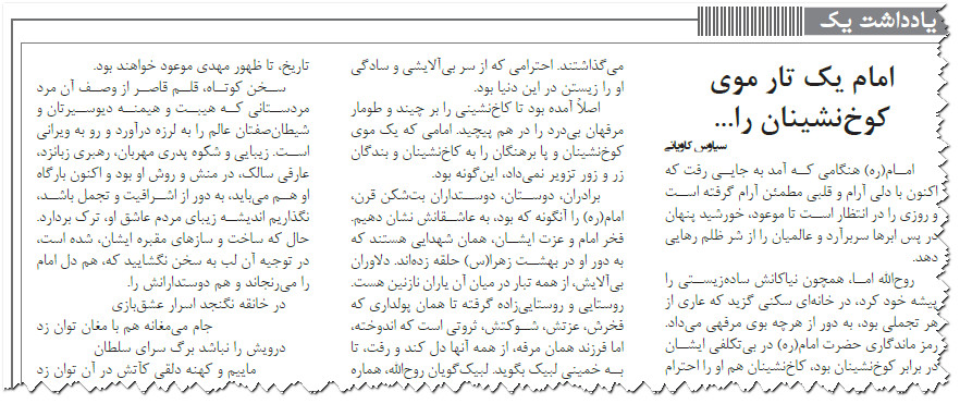 روزنامه سیاست روز در خرداد ۱۳۹۴ در یادداشت صفحه نخست با عنوان «امام یک تار موی کوخنشینان را…» به قلم سیاوش کاویانی نوشته است: «امام (ره) هنگامی که آمد به جایی رفت که اکنون با دلی آرام و قلبی مطمئن آرام گرفته است و روزی را در انتظار است تا موعود، خورشید پنهان در پس ابرها سربرآرد و عالمیان را از شر ظلم رهایی دهد.