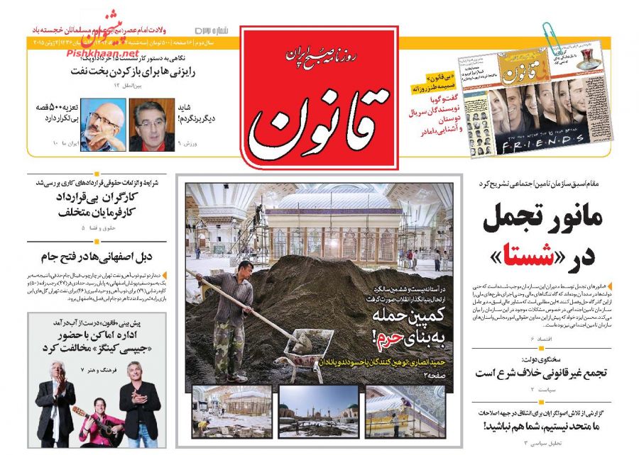 روزنامه قانون دوازده خردادماه با اختصاص عکس صفحه یک خود به مراحل تکمیل سازه جدید حرم، عنوان «کمپین حمله به بنای حرم!» را برای آن برگزیده و همچنین از قول حمید انصاری نیز نوشته است «توهین کنندگان یا حسودند یا نادان». قانون در این گزارش از تحت تأثیر بودن جو حرم امام از فضاسازیهای رسانهای ناشی از شیطنتها و انتقامگیریهای سیاسی خبر داده و آورده است.