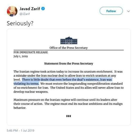 بر اساس این گزارش کاخ سفید در بیانیه‌ای به عبور ذخائر اورانیوم ۳.۶۷ درصدی ایران از ۳۰۰ کیلوگرم واکنش نشان داد و  مدعی شد که ایران قبل از حصول برجام هم مفاد آن را نقض کرده است!