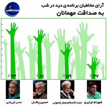 سحر قریشی، شهرام جزایری، حسین پاکدل و حجت الاسلام جعفر شجونی مهمانان بعدی دید در شب بودند که در نظر سنجی میزان صداقت شان با ارای قابل توجهی مواجه شدند.