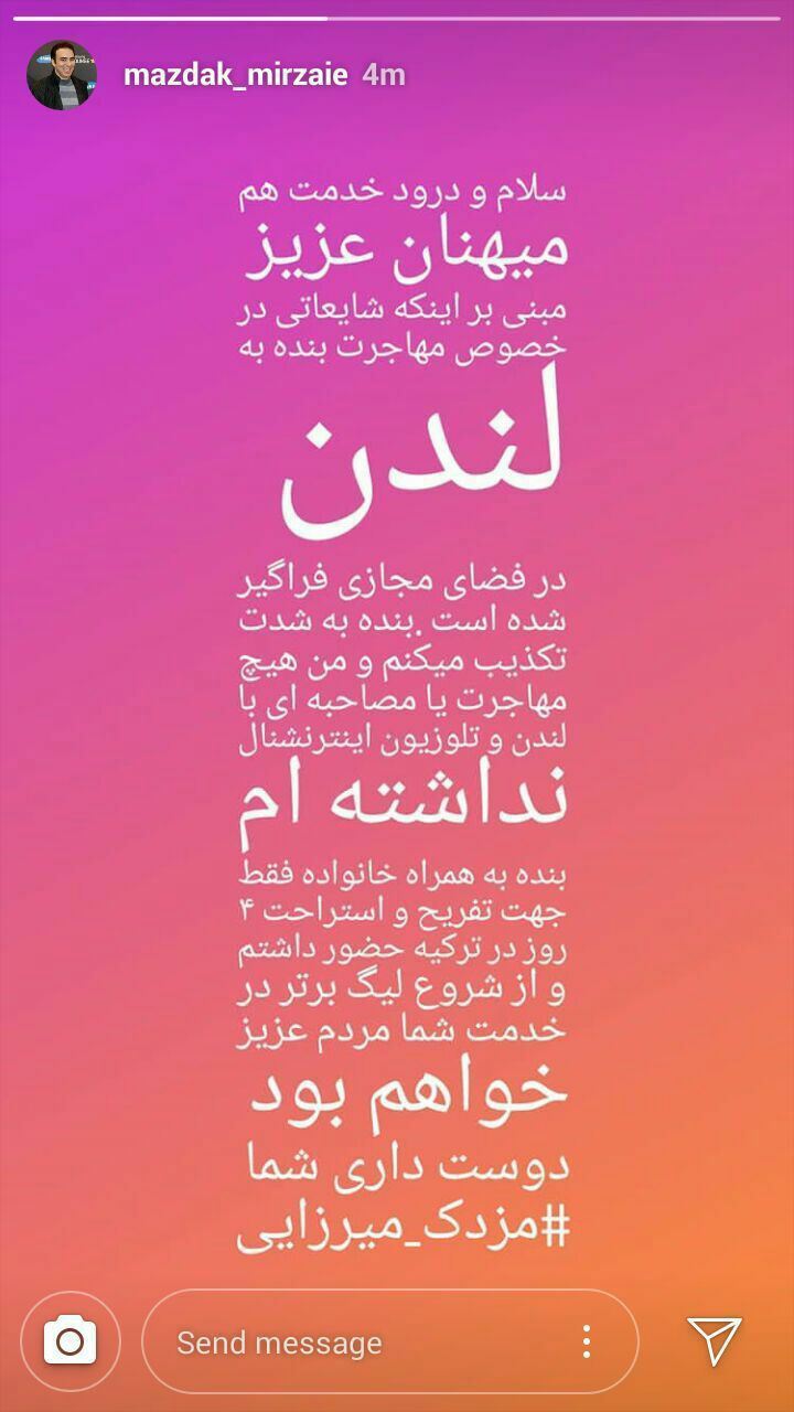 به گزارش انصاف نیوز، مزدک میرزایی بیش از ۲۴ ساعت پس از پخش شایعهی پیوستن به شبکهی ماهوارهای ایران اینترنشنال، در استوری اینستاگرام خود واکنش نشان داد و گفت که برای سفر تفریحی به ترکیه رفته و با شروع لیگ برتر فوتبال «در خدمت شما مردم عزیز خواهم بود».