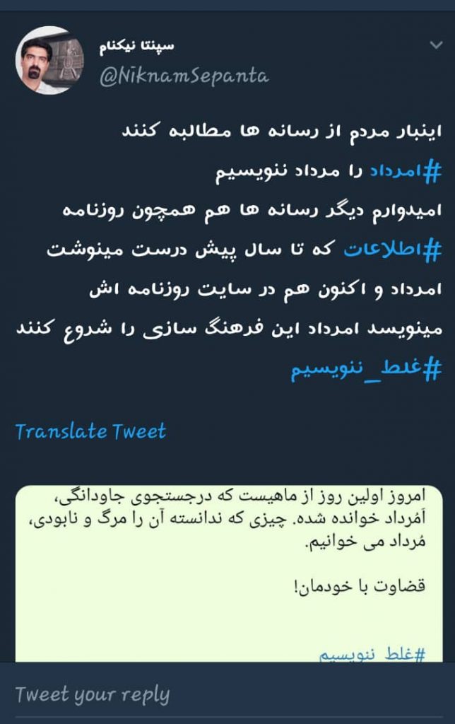 کتایون آزاد، خبرنگار انصاف نیوز: سپنتا نیکنام، عضو زرتشتی شورای شهر یزد، سهشنبه، اول مردادماه در توییتر متنی با مضمون «تغییر واژهی اشتباه مرداد به امرداد در رسانهها» منتشر کرد. این نماینده در گفتوگو با انصاف نیوز دربارهی مطالبهگری رسانهها و تاثیر آن در فرهنگسازی توضیح داده است. همچنین اردشیر بهمردی، دکترای زبانشناسی نیز به چرایی صحیح بودن واژهی امرداد پرداخته.