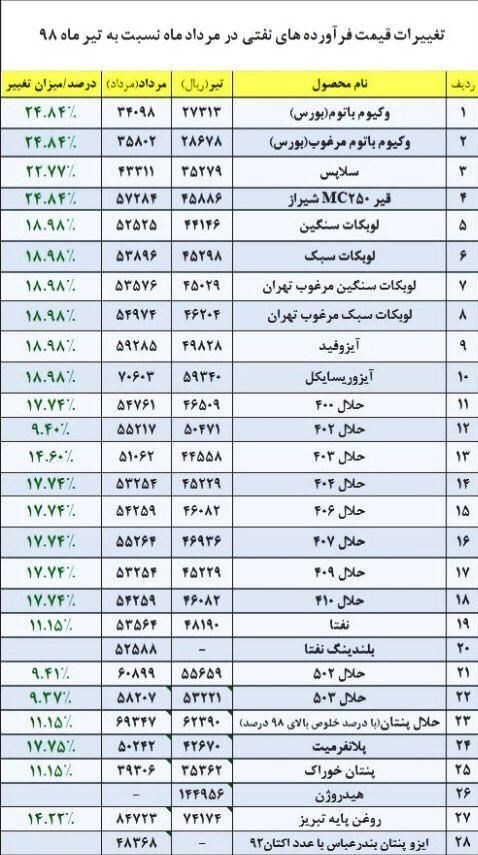 شرکت ملی پالایش و پخش فرآوردههای نفتی ایران، علی رغم کاهش نرخ جهانی قیر و بیس اویل (روغن پایه) و کاهش قیمت دلار، اقدام به افزایش حدود ۲۵ درصدی قیمت وکیوم باتوم و ۲۰ درصدی لوبکات در مرداد ماه کرد.