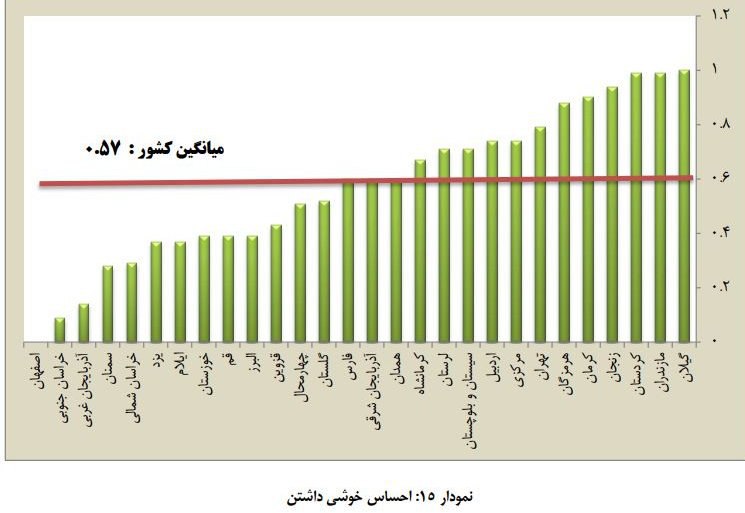 بر پایۀ تحليل شاخص سرمايه اجتماعي در گزارش پایش شاخصهای ملی محیط کسب و کار در راستای سنجش و ارتقای بهرهوری که در سال 1396 توسط پژوهشکده مطالعات توسعه سازمان جهاد دانشگاهی تهران صورت گرفته و وزارت اقتصاد آن را منتشر کرده است، «احساس خوشی داشتن» به عنوان یکی از مولفههای مهم سرمایه اجتماعی، در میان شهروندان استانهای مختلف کشور بررسی شده است.