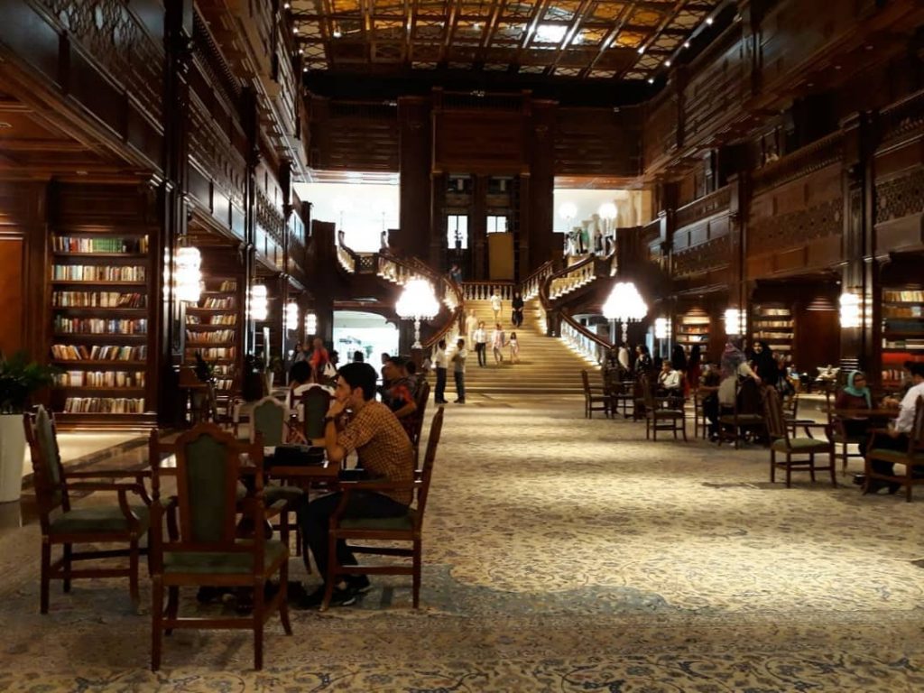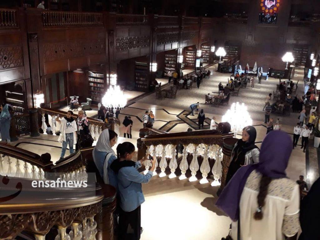 وارد کتابخانهی این مجموعه میشویم، بخشی که به دلیل طراحی غربی که دارد برای اغلب بازدیدکنندگان جالب است و بنابراین از شهرت بیشتری نسبت به بخشهای دیگر برخوردار است، چند متر به چند متر اشخاصی را در حال عکاسی میبینیم و گاه به دلیل شلوغی در این بخش مجبور به رد شدن از جلوی کادر دوربین افراد میشویم، اینجا هیچکس کتاب در دست ندارد مگر برای طراحی صحنهی عکاسی، از کارمند این بخش در مورد نحوهی استفاده از کتابها پرسیدیم و گفت: «کتابها را فقط همینجا میتوانید بخوانید و اجازهی خروج کتاب را نمیدهند، با دوربین و حراست از این مجموعه محافظت میشود، همهی کتابها خریداری شده است و حتی بین اینها کتاب نفیس هم وجود دارد، البته هنوز همهی کتابها تکمیل نشده ولی تا افتتاح کتاب خانه تکمیل خواهد شد.»