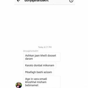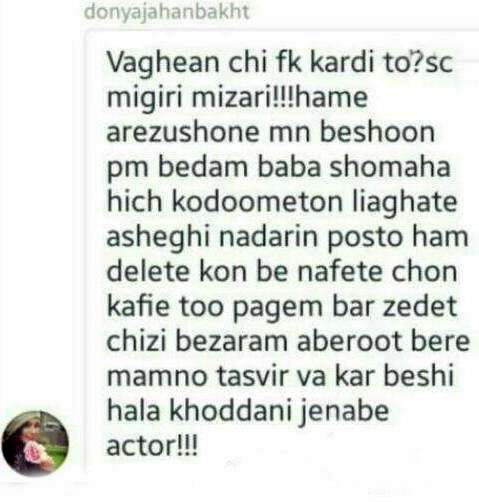 ماجرا از پیغام دنیا جهانبخت به صورت خصوصی به اشکان اشتیاق شروع شد . در این پیغام همانطور که در تصویر زیر ملاحظه می کنید دنیا جهانبخت به اشکان اشتیاق ابراز علاقه می کند . (اشکان جان خیلی دوست دارم … به ما سر بزن و ….)