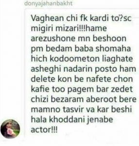 همانطور که در تصویر فوق ملاحظه می کنید دنیا جهانبخت, اشکان اشتیاق را به ممنوع التصویری تهدید کرده است . در ادامه به اشکان اشتیاق خاطر نشان کرده است که همه مردم آرزو دارند بهشون پیغام بدم…! (چه اعتماد به نفس ی) . هیچکدومتون لیاقت عاشقی ندارید . پست پاک کن وگرنه کافیه یک مطلب راجبت تو پیج بنویسم خیلی سریع ممنوع التصویرت میکنن .
