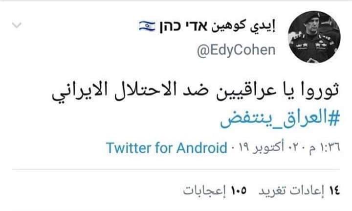 یکی از پدرخوانده های «انقلاب» عراق، جناب آقای ایدی کوهین. رییس مركز مطالعات سادات بیغن وابسته به وزارت خارجه اسرائیل است که در توییتی نوشت: «عراقی ها علیه اشغالگرى ایران بپا خیزید. عراق قیام مىكند»!»