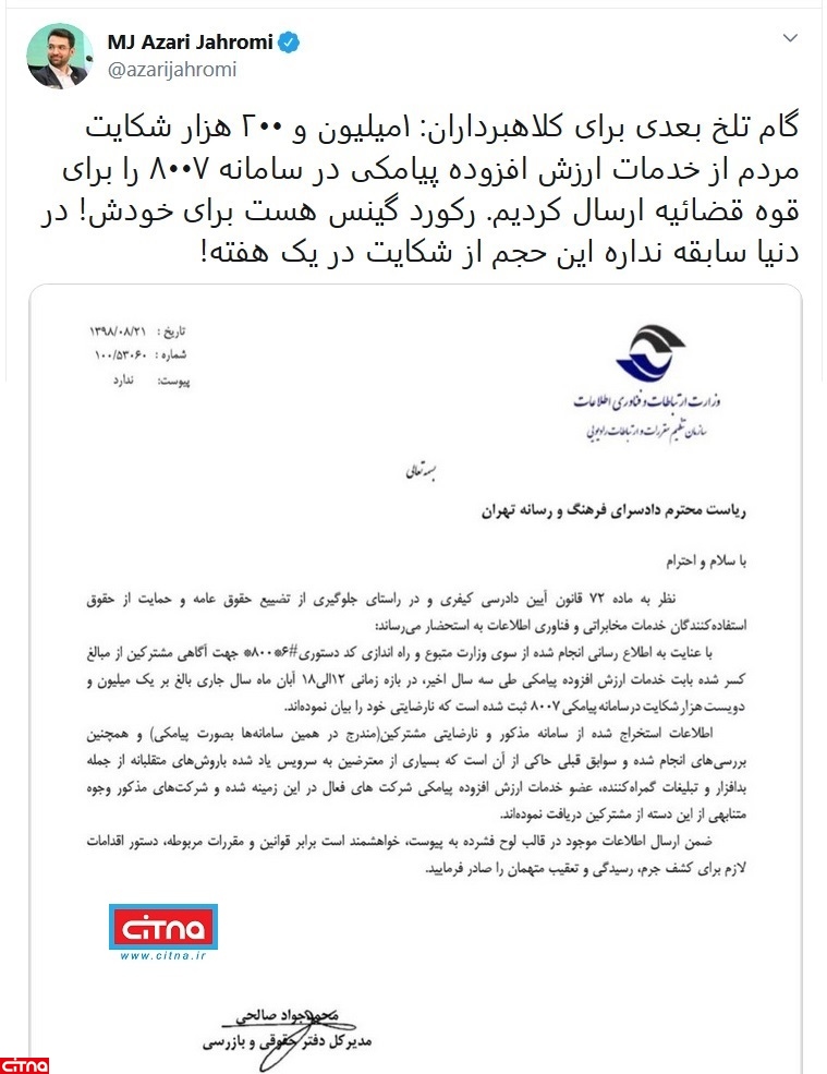 ارسال یک میلیون و ۲۰۰هزار شکایت از خدمات ارزش افزوده به قوه قضائیه