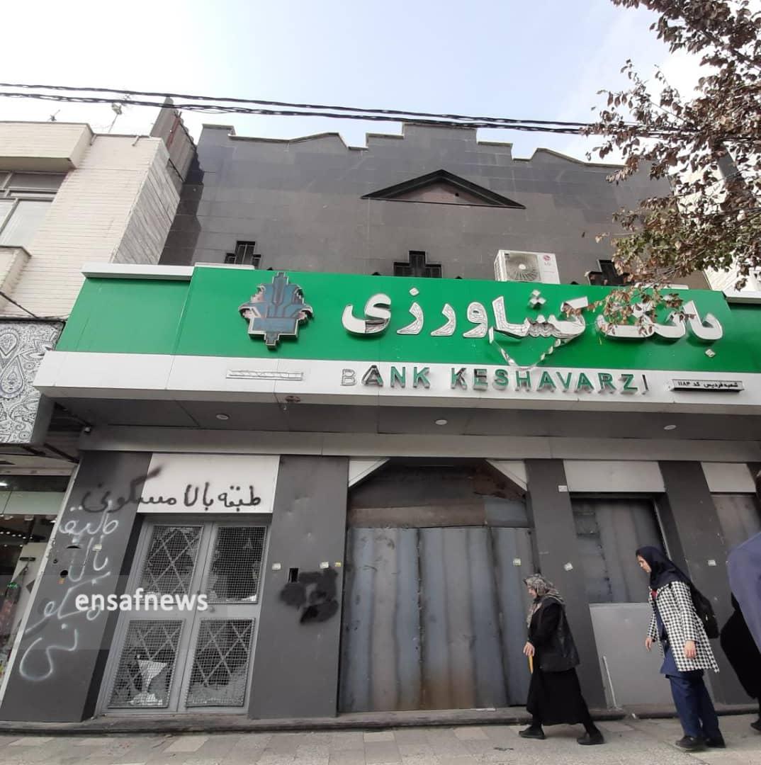 کمی جلوتر به ترتیب بانکهای ملت و کشاورزی تخریب و غیر قابل استفاده است اما بانک کشاورزی به دلیل آنکه در طبقه بالای خود مسکونی بوده، مورد آتش سوزی قرار نگرفته و با اسپری بزرگ روی آن نوشته شده « طبقهی بالا مسکونی است.» و فقط با ضربه به در و پنچره آن را تخریب کردند.