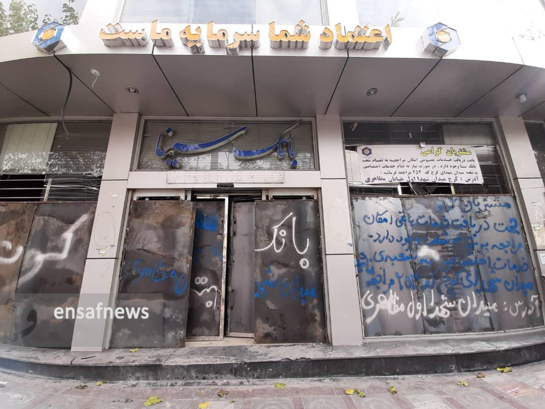 از کنار این اماکن تخریب شده عبور میکنم و به بانک بعدی میرسم که تنها چند قدم جلوتر است، «بانک سینا» هم مطابق دیگر بانکها به دلیل تخریب بالا غیر قابل استفاده است و روی در آهنی، آدرس دیگری برای مراجعه نوشته است.