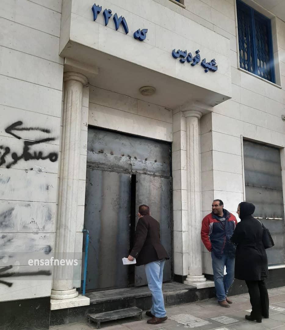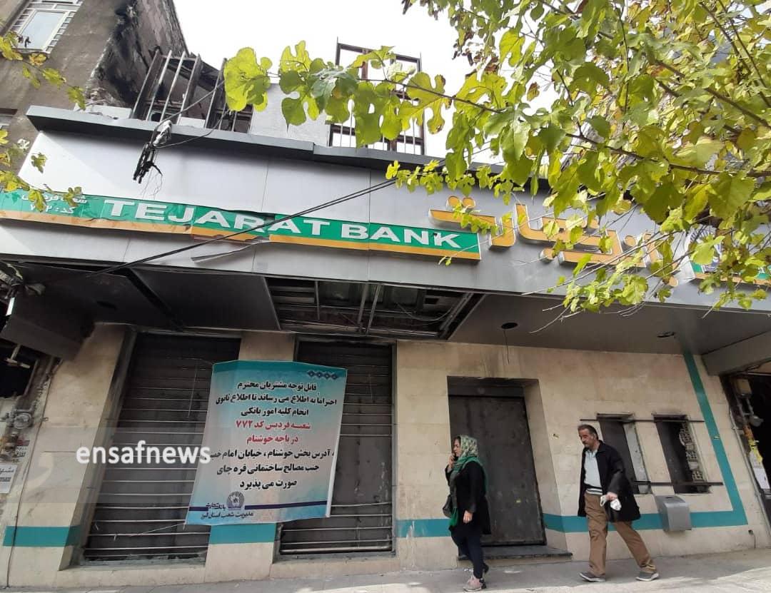 به فاصلهی چند قدمی از بانک رفاه کارگران و قدم زدن روی شیشه خردهها به بانکهای تجارت و توسعهی تعاون میرسم که به دلیل خسارت وارد شده بسته شدند و روی هر کدام مطلبی مربوط به ارجاع مشتریان به آدرسی دیگر و یا پیامی در مورد تعطیلی تا اطلاع ثانوی نصب شده است.