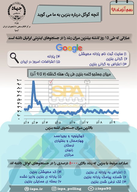 در میانهی آذرماه، ایسنا گزارشی از جدیدترین پژوهش ایسپا را با تیتر «بررسیهای مرکز افکارسنجی دانشجویان ایران نشان میدهد / سهمیهبندی بنزین و جستجوی ایرانیها در گوگل» منتشر کرد که متن کامل آن در پی میآید: