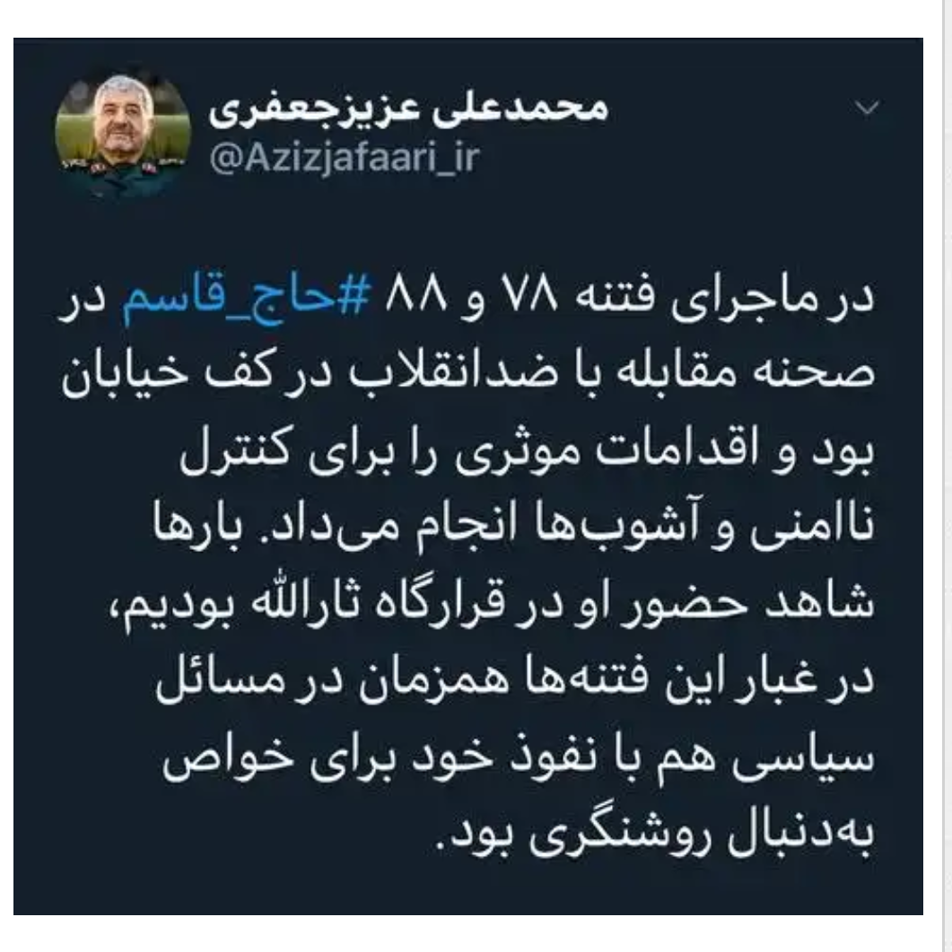 مشرق نوشت: شب گذشته انتشار توییتی از یک حساب کاربری منتسب به سرلشکر عزیزجعفری، جنجالآفرین شد. در این توییت جملهای منتسب به فرمانده سابق سپاه از حضور میدانی شهید سپهبد سلیمانی در فتنه ۷۸ و ۸۸ منتشر شده است.