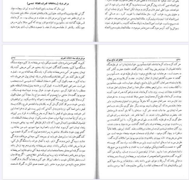 و نکته آخر اشاره به داستانی است که حاج سیاح در خاطرات خود از روزگار منحوس قاجاریه ارائه می دهد. او در باره انتشار وبا در ایران می نویسد:«سال (۱۲۸۲ ه.ش.) که صدارت با عینالدوله است و ایران بیچاره دچار گرانی غله چندین ساله میباشد، هنوز این بلا و بلاهای تعدیات حکام رفع نشده وباء در ایران ظاهر شد. شیوع این مرض اول در عتبات و عربستان بود، در کرمانشاه قرنطینه گذاشته شد، مأمورین و اطباء مواظب بودند که کسی مبتلا باین مرض عبور نکند. یک نفر از علماء معروف از نجف با جمعیت و طلاب زیادی بعزم مشهد حرکت کرده وارد کرمانشاه شد. اطباء و مأمورین خواستند ایشان را در قرنطینه نگاه داشته اطمینان از نبودن مریض پیدا کنند. ایشان گفتند: «قدوم حضرت آقا برکت و رحمت است، هر جا وارد شود بلا رفع میشود! نباید قرنطینه شوند.» مأمورین گفتند: «حضرت آقا و غیر ایشان از امثال ایشان در نجف و کربلا بودند پس چطور بلا وارد شد؟» همراهان آقا باین دلیل واضح با چماق جواب داده، طبیب و مأمورین را کتک سخت زدند. در ایران هم بخلاف حکم خدا بر اعمال و جنایات اهل عمامه مؤاخذه و مجازات نیست، بزور وارد کرمانشاه شدند وبا هم که همراه خود آورده بودند در کرمانشاه طلوع کرد و همان روز جمعی مبتلا شدند و بیست و سه نفر همان روز اول مردند. همراهان حضرت آقا متفرقاً بروجرد و اصفهان و همدان و سایر جاها رفتند و مردم که آن چماق را دیده بودند دیگر جلوگیری نکردند، وباء هم همراه ایشان بهرجا وارد شدند، نشر کرد.