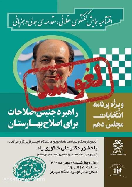 انجمن فرهنگ و سیاست دانشجویان دانشگاه شیراز با استعانت از الطاف الهی و در راستای اجرای منویات مقام معظم رهبری و در جهت تقویت و نهادینهسازی فضای عقلانی و ضابطهمندی در تضارب آرا و مداومت در تحرک و کوشش علمی همایشی با عنوان «گفتگوی عقلانی، مقدمهی همدلی و همزبانی» را برنامهریزی و پیش بینی کرده بود و در همین راستا موافقتهای لازم برای برگزاری این همایش پنج روزه به همراه دعوت از جناب دکتر علی شکوریراد دبیر کل محترم حزب اتحاد ملت ایران اسلامی برای سخنرانی در مراسم افتتاحیهی این مراسم را از هیات ناظر بر تشکلهای اسلامی در جلسهی برگزار شدهی این هیات روز شنبه مورخ 24 بهمن ماه این هیات اخذ کرده بود که متاسفانه نیمه شب گذشته پس از صدور بیانیههای مختلف و شدیداللحن توسط نیروهای تندرو خودسر و تهدید به انجام حرکات انقلابی خارج از اصول اسلام و قانون از سوی ایشان، خبر لغو این سخنرانی به صورت پیامک به این تشکل اعلام شد.