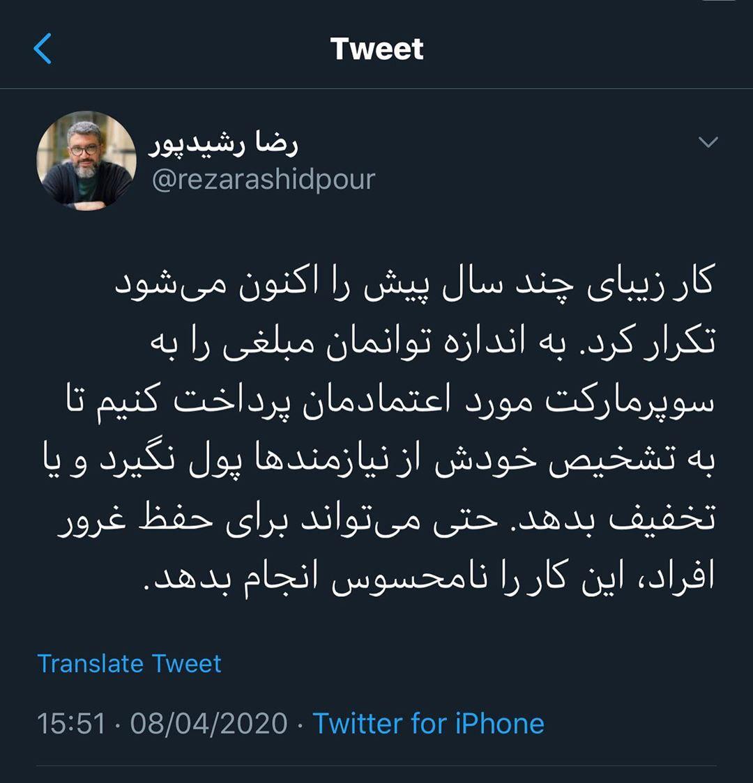 جناب رضا رشیدپور. براساس تحقیقات بنده، جنابعالی برای تهیه هر اپیزود حالا خورشید حدود چهل میلیون تومن دریافت کردید. نیمی از این مبلغ دستمزد شخصی خودتان برای اجرا بود. یعنی درآمد شما در زمان اجرا حالا خورشید ماهی چهارصد و سی و سه میلیون بود. آنهم در زمانی که حقوق پایه یک کارگر یک میلیون وصد هزار بود. یعنی معاپل حقوق سیصد و نود و سه کارگر. سه ماه پیش هم برای دو شب اجرای شب یلدا پس از کش و قوس ها و چانه زنیها به مبلغ پانصد میلیون راضی شدید. یعنی درامد شبی دویست و پنجاه میلیون.