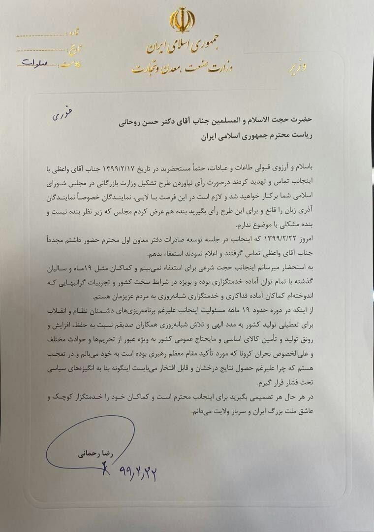 امروز 1399/2/22 که اینجانب در جلسه توسعه صادرات دفتر معاون اول محترم حضور داشتم مجددا جناب آقای واعظی تماس گرفتند و اعلام نمودند استعفا بدهم.