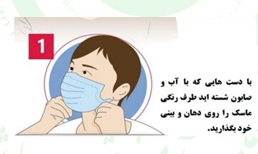 – قبل از استفاده از ماسک، باید دستان خود را با محلول الکلی ۷۰ درصد و یا با آب و صابون به مدت ۲۰ ثانیه تمیز کنید.