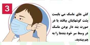 – حین استفاده دست را در داخل کشها کرده و ماسک را روی بینی و دهان خود قرار دهید و بدین ترتیب کشها را پشت گوش بیندازید.