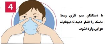 – ماسک قسمت ضخیمی دارد (نوار فلزی کوچک) که باید حتما در بالا روی بینی قرار گیرد. بعد از قرارگیری، قسمت ضخیم راکه روی بینی و گونهها است، فشار می دهیم تا هیچگونه هوایی وارد نشود.