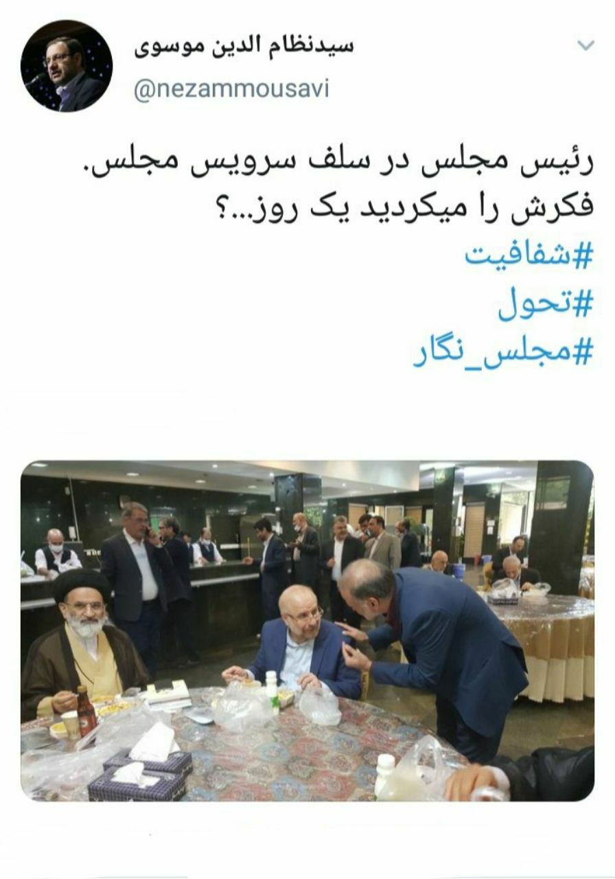 رئیس سابق خبرگزاری فارس که به عنوان نماینده تهران راهی مجلس شده حضور قالیباف در سلف سرویس مجلس را با هشتگ #تحول و “فکرش را میکردید یک روز…” توئیت کرده!