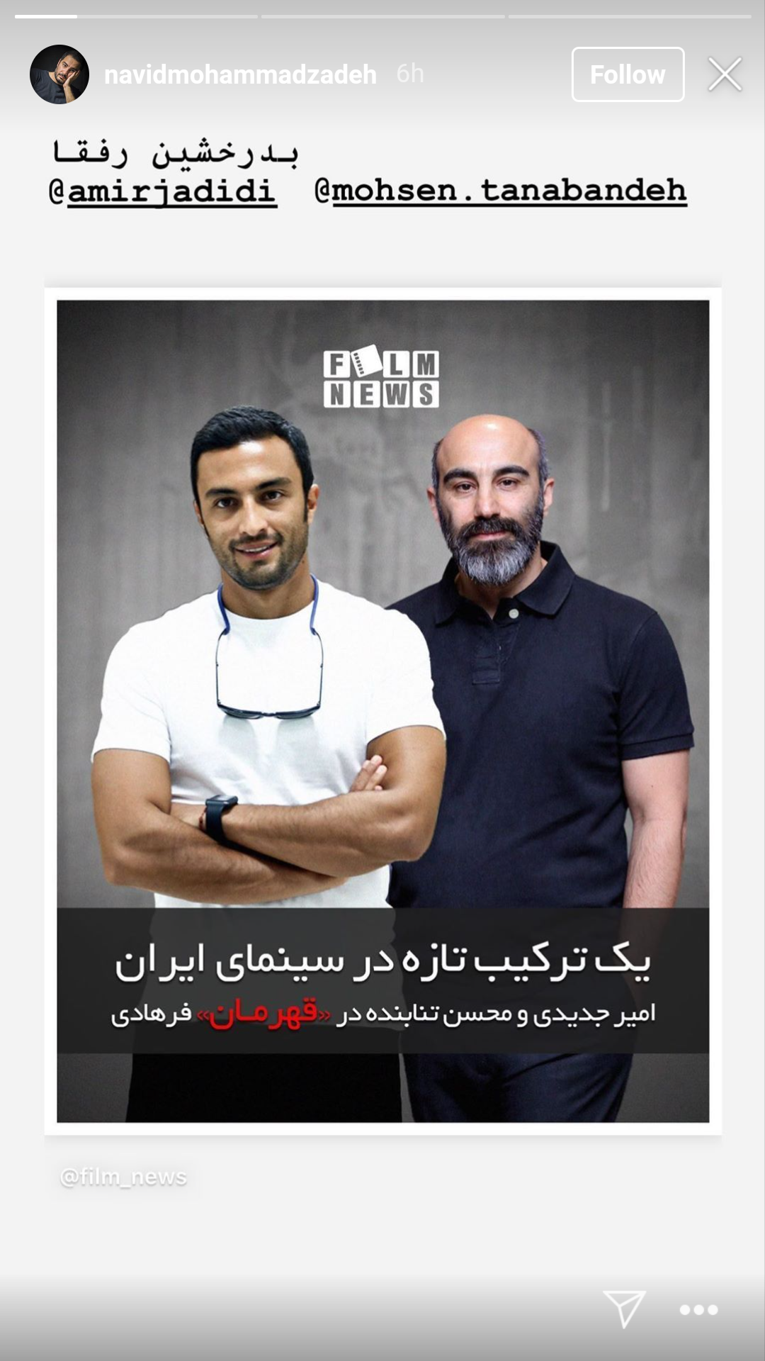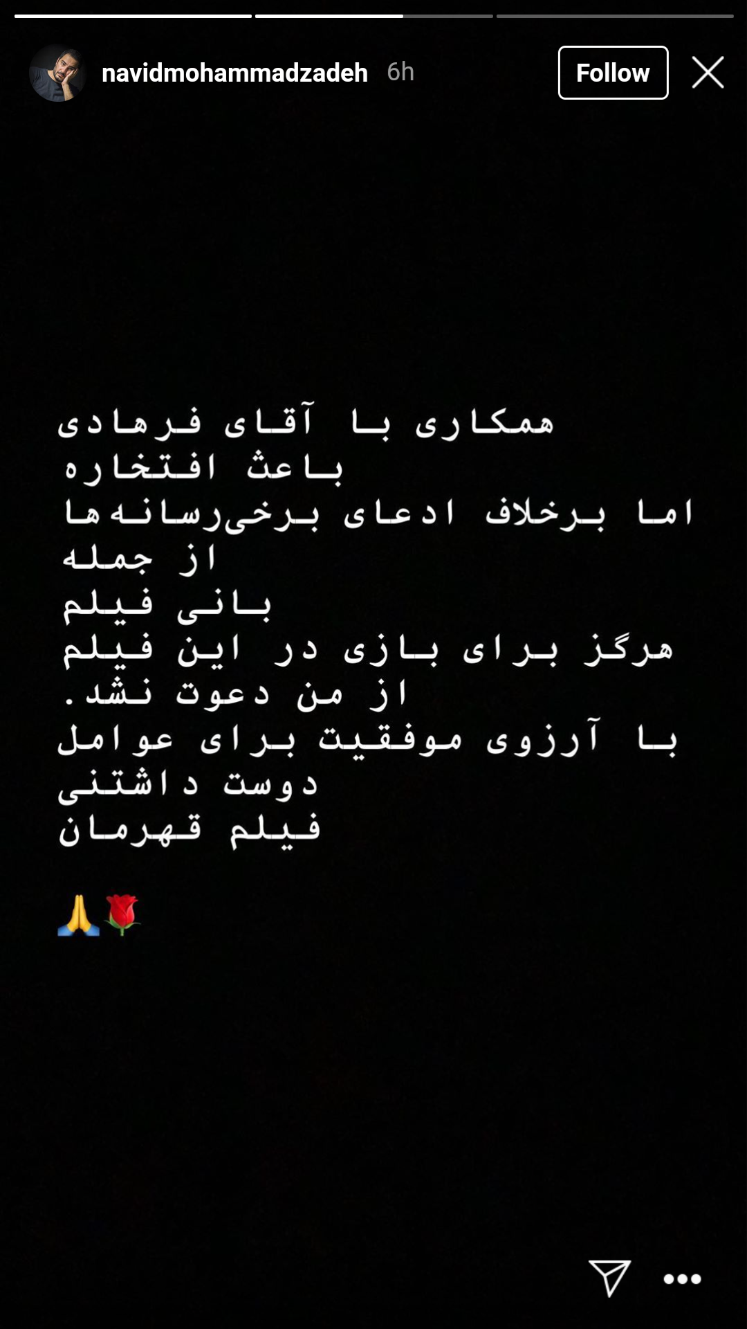 نوید محمدزاده با آرزوی موفقیت برای این دو بازیگر و فیلم «قهرمان» این دو استوری را در واکنش به برخی شایعات در صفحهی اینستاگرام خود منتشر کرد.