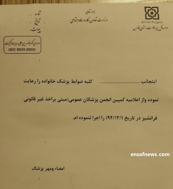 خبر رسیده به خبرنگار انصاف نیوز حاکی از این است که: پزشکان خانواده ی استان فارس به علت عدم پایبندی بیمه ی سلامت به تعهداتش و پرداخت نکردن حقوق پزشکان عمومی در چند ماه گذشته، روز یک اسفند ویزیت بیماران را آزاد اخذ کردند و البته پولش هم به موسسات خیریه دادند که هشداری باشد به بیمه ی سلامت مبنی بر پایندی به تعهداتش، همانطور که پزشک های عمومی با وجود پرداخت نشدن چندماهه ی حقوقشان همچنان پایبند بودند، امروز این نامه ای را آوردند برای پزشک های خانواده ی «کازرون» که فکر کنم از آنها برائت بگیرند که برای گرفتن حق طبیعی و قانونی خود اجازه ی اعتراض ندارند. حالا خوب است که این قوانین را خودشان وضع کرده اند!