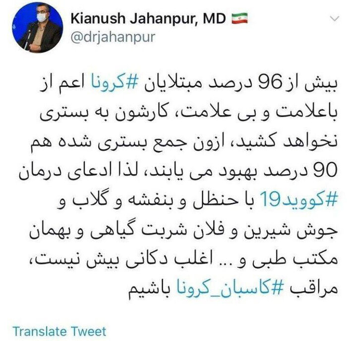 کیانوش جهانپور، رییس مرکز روابط عمومی و اطلاع رسانی وزارت بهداشت در صفحه‌ی توییتر نوشت: مراقب کاسبان کرونا باشید.