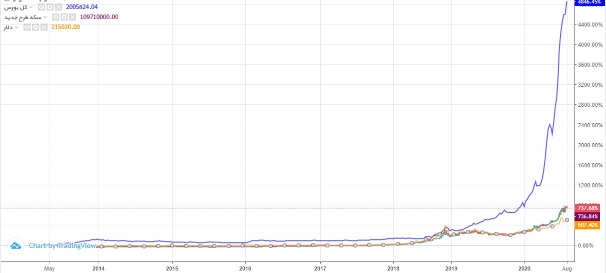 نمودار زیر مقایسهی شاخص بورس، طلا و دلار از سال گذشته تاکنون است. خط آبی مربوط به بازار بورس، خط بنفش مربوط به بازار طلا و سکه و خط نارانجی مربوط به بازار ارز است.
