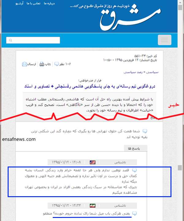 به گزارش انصاف نیوز، در زیر متن این رسانهی خاص که به رییس مجمع تشخیص مصلحت نظام و منتخب اول انتخابات خبرگان توصیه کرده «با شرایط پیش آمده بهترین راه حل آن است که هاشمی رفسنجانی مطلب اشتباه خود را که احتمالا و با دیده حسن ظن از سر «ناآگاهی» است، تصحیح کند و فریب «خیانت» اطرافیان و تیم رسانه خود را نخورد»، کامنتهای زیادی حاول بی اخلاقی دیده میشود از جمله چند کامنتی که در پی میآید:
