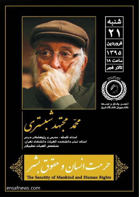 به گزارش خبرنگار انصاف نیوز در شیراز، دکتر محمد مجتهد شبستری، فیلسوف اسلامی، استاد الهیات تطبیقی و روشنفکر دینی معاصر کشورمان، روز شنبه به دعوت انجمن وفاق و توسعه دانشجویان دانشگاه شیراز و با موضوع “حرمت انسان و حقوق بشر” در تالار فجر دانشگاه شیراز سخنرانی خواهد کرد.