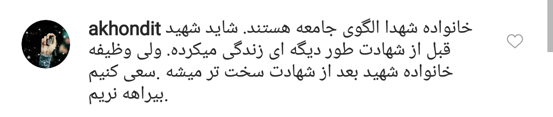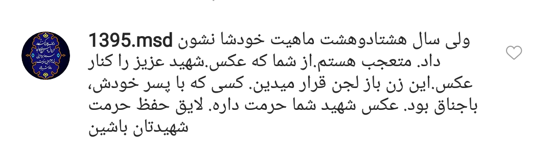 و شهدا را نمی توان در یک خط نوشت.همسر بزرگوار شهید خیلی احساسی برخورد کردهاند.این چیزی نیست که شهدا انتظار دارند. آیا من هم بعد از مرگ فلان خواننده ایرانی در غرب بگویم من آن آهنگ خدا خدایش را خیلی دوست دارم و با گوش دادن به آن خدا را شناختم.