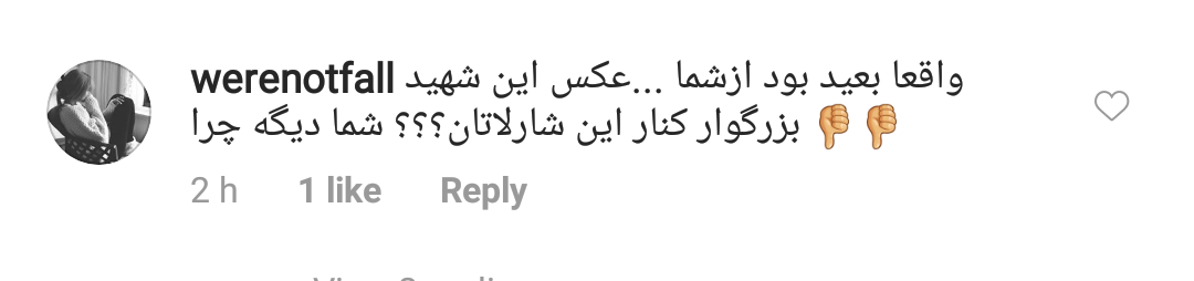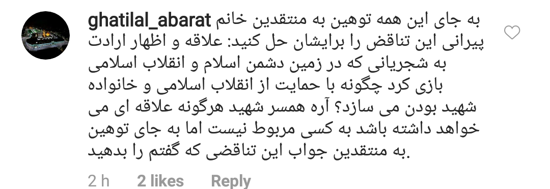 یاد اون صحبتی افتادم که می گفت آنهایی که شهید شدند و جنگ را به انجام رساندند فرزندان دوران رژیم منحوس بودند و حالا متوجه شدم که کامنت نویس های زیر پیج این سرکار خانم محترمه، فرزندان نظام مقدس هستند که لازم بود حاضریشون را بزدند.