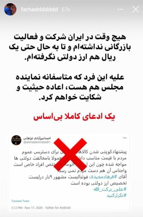 فرهاد مجیدی سرمربی سابق استقلال نیز در واکنش به این توئیت نوشت: هیچ وقت در ایران شرکت و فعالیت بازرگانی نداشتهام و تا به حال حتی یک ریال هم ارز دولتی نگرفتهام.