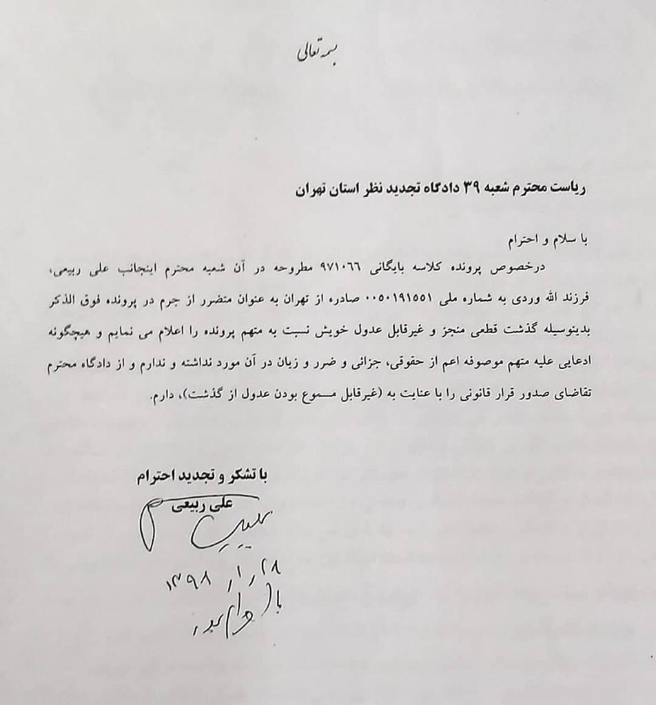 علی ربیعی سخنگوی دولت با اشاره به انتشار خبر شلاق زدن به یک کارگر، در توییتر خود با اشاره به روند طی شده در این پرونده میگوید که دلیل این اتفاق را نمیداند. نامهی فروردین ماه سال ۹۸ او نیز امروز منتشر شده است.