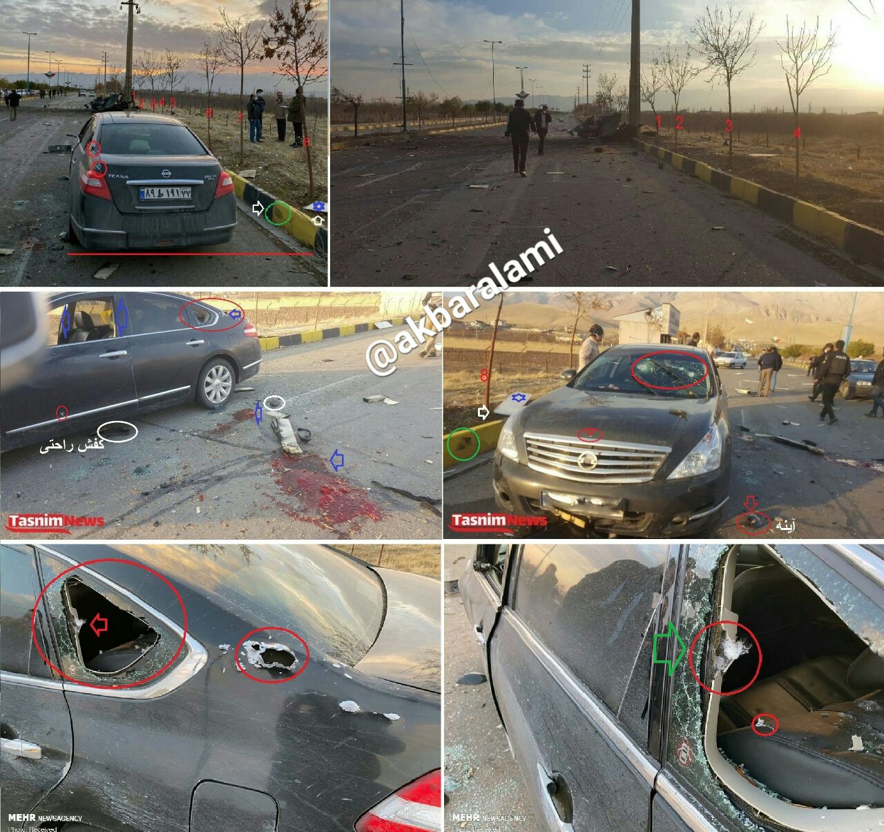 ۷. از تصاویر منتشر شده چنین بنظر میرسد که تروریستها برای متوقف کردن خودروی حامل شهید فخریزاده ابتدا نیسان بمبگذاری شده را منفجر کردهاند تا در اثر این انفجار راننده خودروی هدف غافلگیر و و برای انجام عملیات تروریستی ناچار به توقف شود.